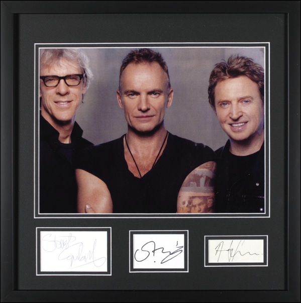 Felt tip signatures of Sting and Andy Summers and a ballpoint signature of Stewart Copeland on individual off-white cards. All three are double matted and framed with a group photo, to an overall size of 18.25 x 18.25. In very fine condition. COA Roger Epperson/REAL and R&R COA.