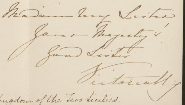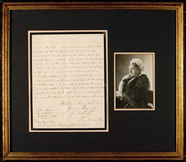 LS signed “Madam My Sister, Your Majesty, Good Sister, Victoria R”,” one page, 7.25 x 9.25, black-bordered mourning stationery, December 21, 1849. Victoria writes to “My Good Sister, Queen of the Kingdom of Two Sicilies.” In part: “The Sentiments of Friendship which I entertain … will not permit me to delay announcing to you the death of my beloved Aunt Her Majesty The Queen Adelaide, widow of His late Majesty King William the Fourth, which took place shortly before Two O’Clock on the morning of the 2d Instant, in the 58th year of Her Age. In communicating to your Majesty this melancholy intelligence, I feel persuaded that you will kindly participate in the grief which I fell at the loss of a Relative justly and universally venerated for the many Virtues and excellent Qualities which adorned her character….” Matted and framed with a photo to an overall size of 17.75 x 15. Intersecting mailing folds and a hint of very subtle soiling, otherwise fine condition. Auction LOA John Reznikoff/PSA/DNA and R&R COA.
