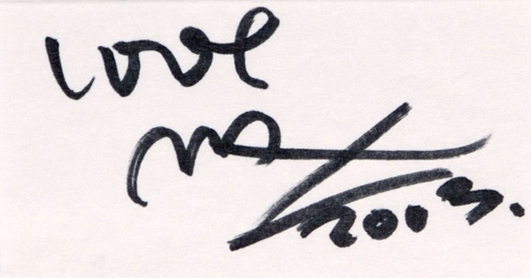 Artist noted for his undulating graphic designs in bright, vibrating colors. Felt tip signature, “Love, Max,” on a white card, dated 2003. Triple matted with a color photo of Max’s Statue of Liberty print, to an overall size of 12 x 18. In very fine condition. R&R COA.