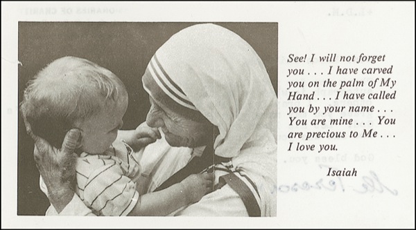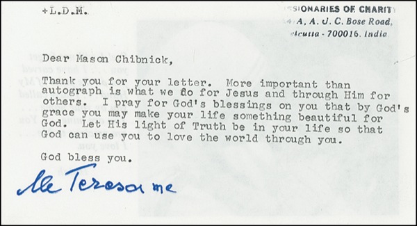 TLS signed “M. Teresa mc,” one page on the reverse of a prayer sheet, 6.5 x 3.5, stamped Missionaries of Charity letterhead, no date. Letter of response to an autograph seeker. In part, “More important than autograph is what we do for Jesus through Him for others…Let His light of Truth be in your life so that God can use you to love the world through you.” Accompanied by the original mailing envelope. In fine condition, with small tear to right edge. R&R COA.