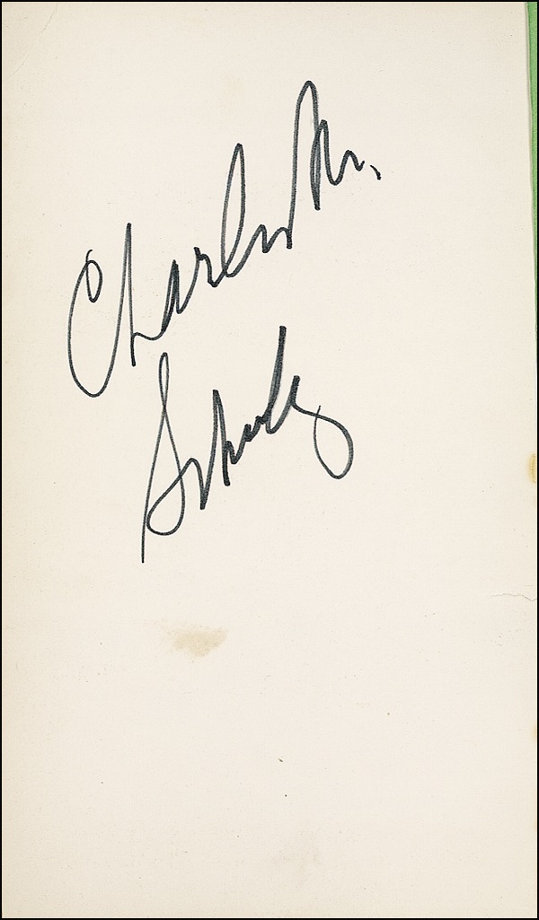 Signed book: It’s A Mystery, Charlie Brown. NY: Scholastic, 1975. Paperback, 4.25 x 7. Signed on the inside of the front cover in black felt tip, “Charles M. Schulz.” In fine condition, with scattered light creasing to spine, not affecting signature, and some wear to spine. R&R COA.