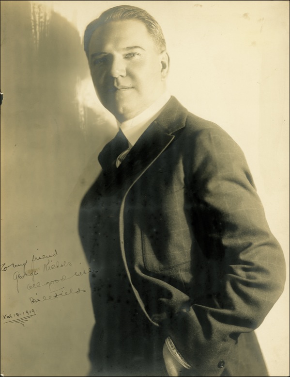 Acclaimed American actor (1880–1946) best known for his persona as a misanthrope and a comic tippler. Early matte-finish 8.75 x 11.25 photo, signed and inscribed in ink, “To my friend George Nichols, All good wishes, Bill Fields, Nov. 18, 1919.” In very good condition, with light scattered soiling and a few small spots, a few faint bends, chip to left edge, and a hint of silvering. PSA/DNA Auction LOA and R&R COA.