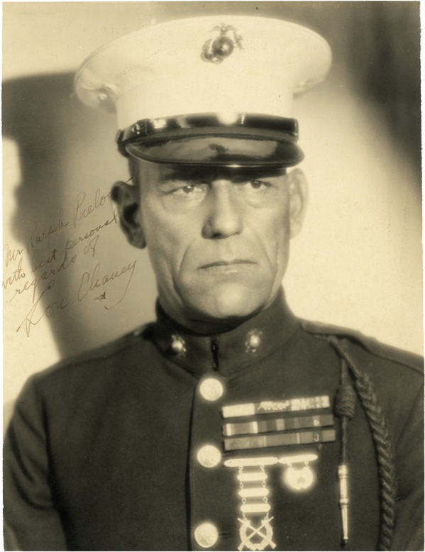Popular American actor (1883–1930) whose versatility in such silent-era classics as The Phantom of the Opera and The Hunchback of Notre Dame earned him the moniker “Man of a Thousand Faces.” Scarce vintage matte-finish 9.25 x 12.25 photo (affixed to a same-sized heavy card) of Chaney in Marine dress uniform as he appeared in the 1926 film Tell It to the Marines, signed and inscribed in fountain pen, “Mr. Ralph P— with best personal regards of Lon Chaney.” Chaney singled out the film, in which he portrayed a tough-as-nails drill sergeant, as one of his favorites, and it was so well received that the Marine Corps made him its first honorary member from the motion picture industry. Photo mounted as noted, a very subtle hint of soiling, and slight trimming to edges (just touching one word of inscription), otherwise fine condition. Uncommon! PSA/DNA Auction LOA and R&R COA.