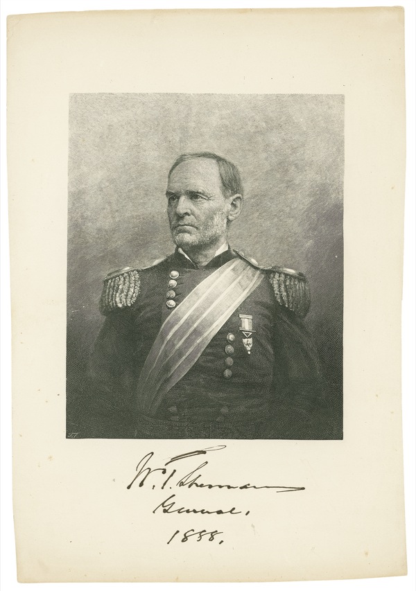Distinctive steel engraving of the famed Union general in full dress uniform, 7.5 x 11, boldly signed in ink in the margin below the image, “W. T. Sherman, General, 1888.” In fine condition, with slightly trimmed edges and subtle edge toning. R&R COA.