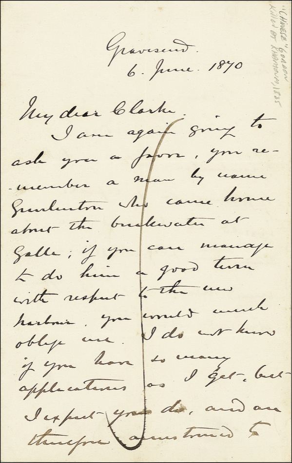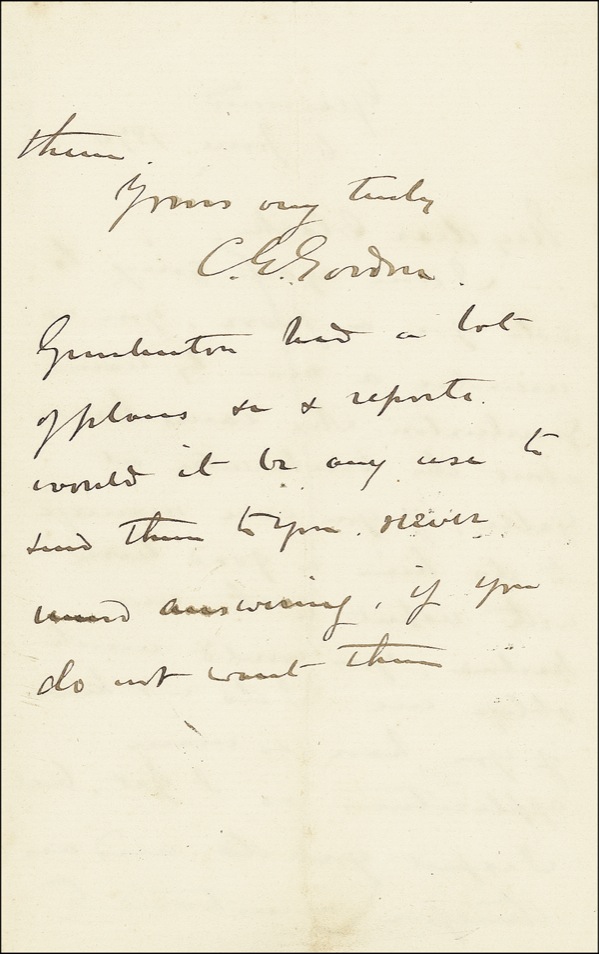 British general (born 1833) who, in 1860, crushed the Taiping Rebellion in China, earning the nickname “Chinese.” Later appointed Governor General of the Sudan, he traveled to Egypt in 1884 to organize the defense of Khartoum against a rebel uprising and was killed there on January 26, 1885, two days before a relief force arrived. ALS signed “C. G. Gordon,” one page both sides, 4.25 x 7, June 6, 1870. Gordon writes from Gravesend to “My dear Clarke.” In part: “I am again going to ask you a favor. You remember a man by name Gimlinton who came … about the breakwater in Galle; if you can manage to do him a good turn with respect to the new harbor, you would much oblige me. I do not know if you have so many applications as I get….” Long vertical ink stroke to first page and light intersecting mailing folds (vertical fold lightly touching “G” of signature), otherwise fine condition. R&R COA.