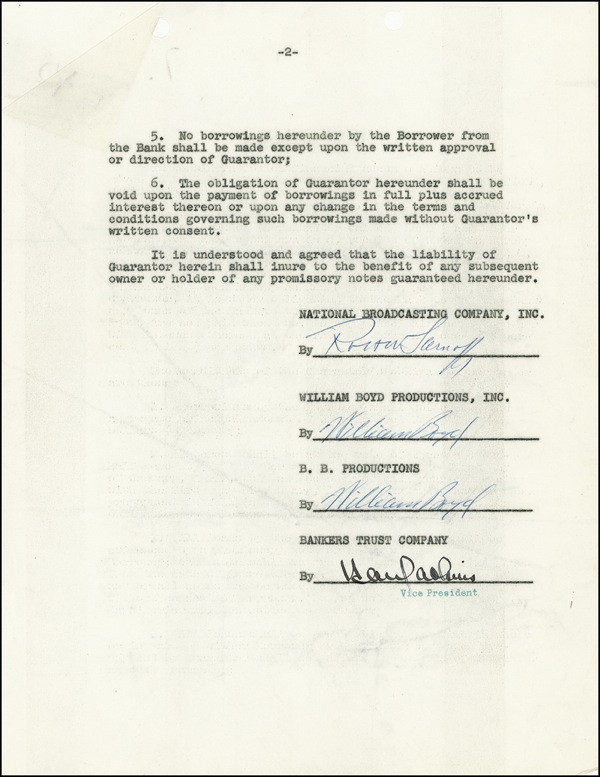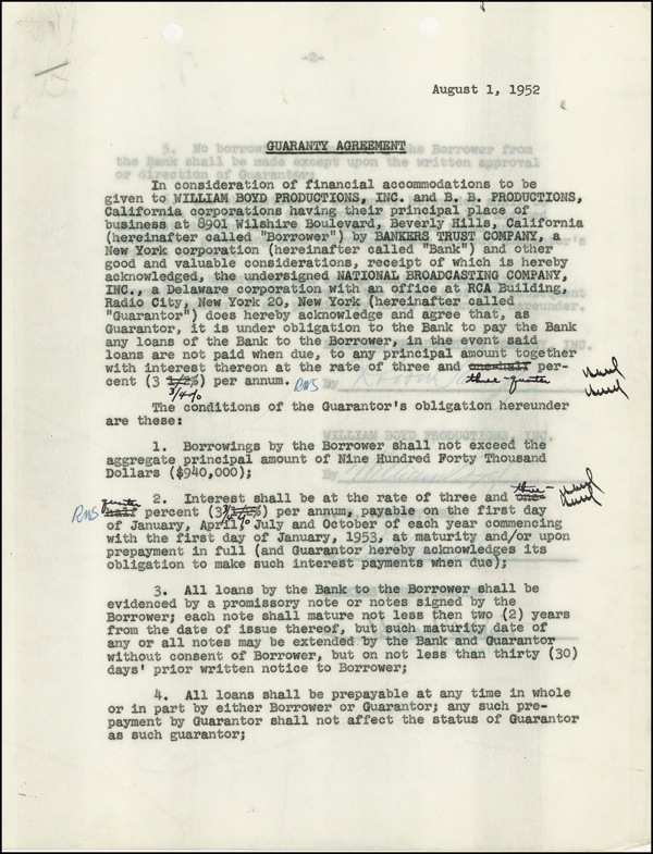 DS, signed twice “William Boyd,” two pages on onionskin, 8.5 x 11, August 1, 1952. An agreement wherein NBC guarantees repayment of a bank loan taken out by Boyd’s production company. Staple and file holes, horizontal fold, and light wrinkling and handling wear, otherwise fine condition. R&R COA.