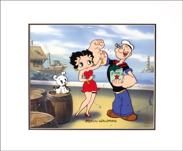 Limited edition hand-painted animation cel, #AP 29/50, entitled Photo Op, 12.5 x 10, showing Popeye having his bicep squeezed by Betty Boop, signed in black felt tip by Waldman. Double matted to an overall size of 18 x 15. In very fine condition. R&R COA.