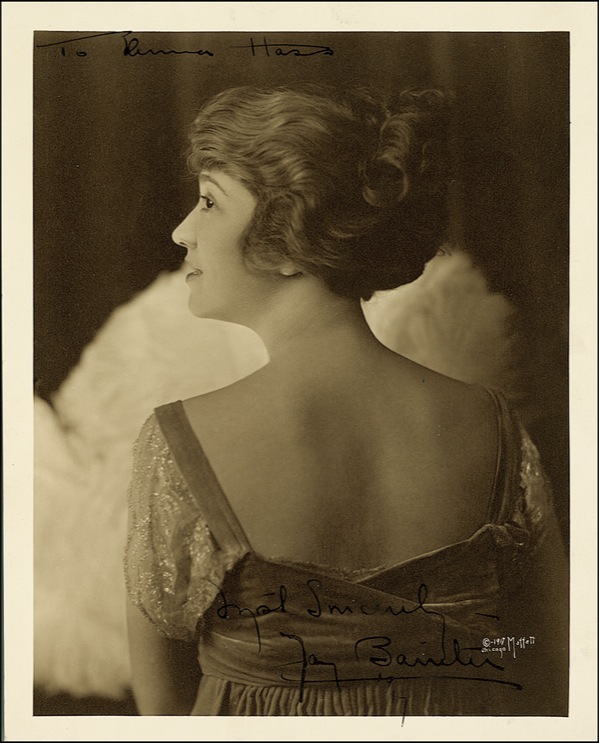 American actress (1893–1968) who won the 1938 Academy Award for Best Supporting Actress for her role in Jezebel. Lovely early sepia matte-finish 8 x 10 photo, signed and inscribed in fountain pen “To Alma Hass, Most sincerely, Fay Bainter.” In very fine, fresh condition. R&R COA.
