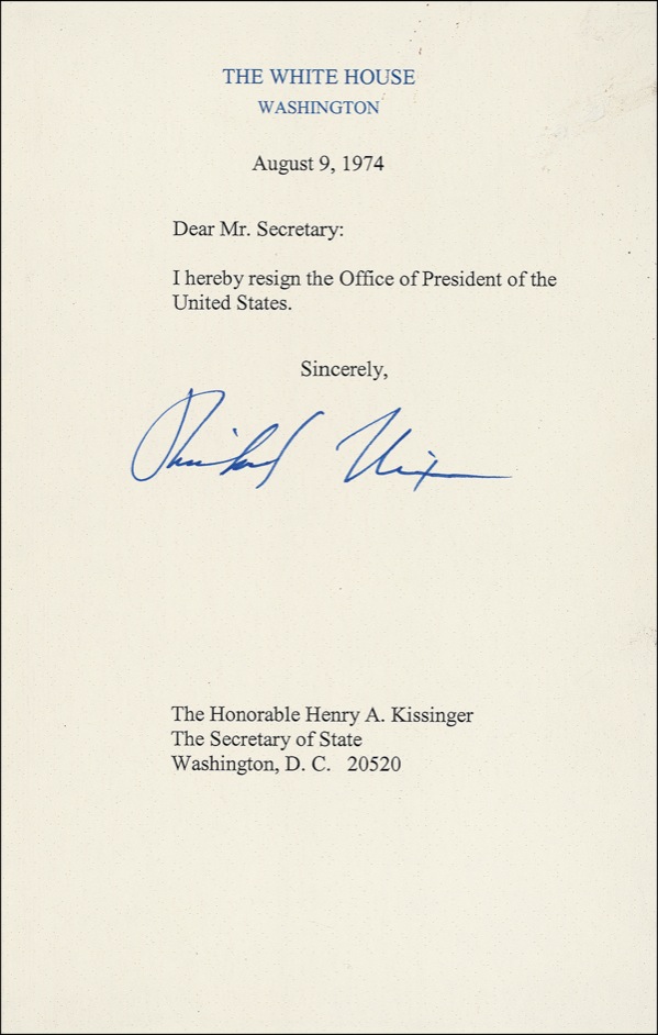 Typed souvenir presidential resignation, one page, 5 x 8.25, on mock White House letterhead, dated August 9, 1974 (but signed later). A letter to Secretary of State Henry Kissinger, in full: “Dear Mr. Secretary: I hereby resign the Office of President of the United States.” Signed boldly at the conclusion in black ink. In fine condition, with paper remnants to top right. Auction LOA John Reznikoff/PSA/DNA and R&R COA.
