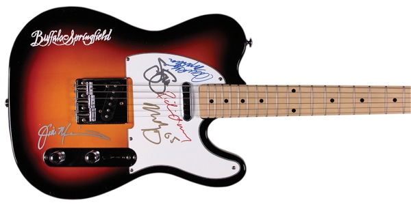 Sunburst-finish Copley ‘telecaster-style’ electric guitar, bearing the band’s name on the body, signed on the body by Jim Messina, and on the white pickguard by Neil Young, Stephen Stills, Richie Furay, and Dewey Martin. In fine condition. R&R COA. Oversized.