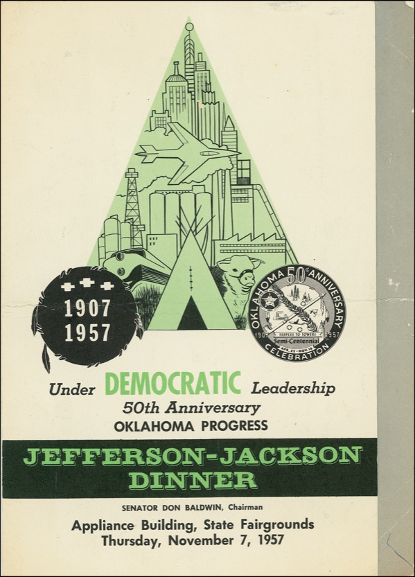 Program from the “Jefferson Jackson Dinner” at the Oklahoma State Fairgrounds, 6.75 x 9.5, November 7, 1957, signed in pencil near his interior photo “John Kennedy.” Kennedy’s page is also signed in ink by Senator Mike Monroney, and the opposite page is signed by Senator Robert S. Kerr. In very good condition, with creases (vertical crease just touching “y” of Kennedy’s name), scattered wrinkling and light soiling, and edge tear to unsigned page. Auction LOA John Reznikoff/PSA/DNA and R&R COA.
