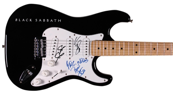 Black-bodied California ‘stratocaster-style’ electric guitar, signed on the white pickguard in felt tip by the complete 1979-82 lineup: Ronnie James Dio, Tony Iommi, Vinnie Appice, and Geezer Butler, adding “Mob Rules.” In fine condition. R&R COA. Oversized.
