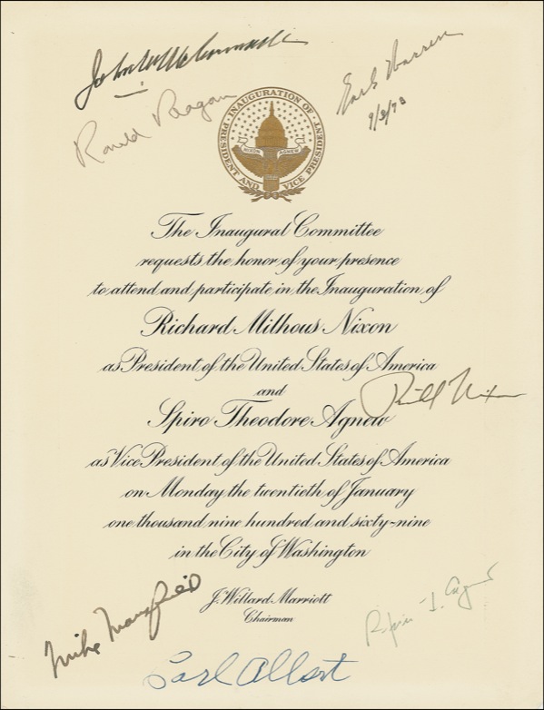 Embossed inaugural invitation for the January 20, 1969, inauguration of President Richard Nixon, signed in ink and felt tip by seven, including members of the Inaugural Committee. Signers are: Richard Nixon, Spiro Agnew, Earl Warren, John W. McCormack, Carl Albert, Mike Mansfield, and Ronald Reagan. In fine condition. R&R COA.