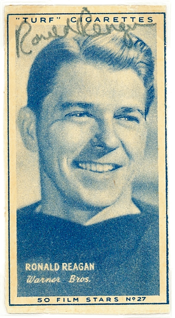 Original Turf Cigarette trading card, 1.5 x 2.75, issued in the 1940s, signed across the top in black ink by Reagan. Consignor indicates signature was acquired in 1974. In fine condition. R&R COA.