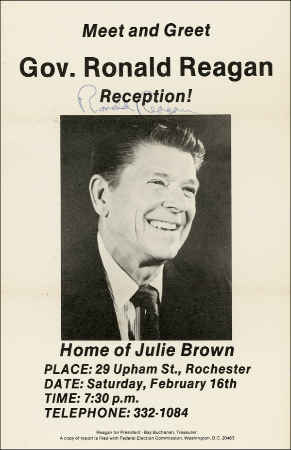 Campaign flyer featuring a photo of Reagan, evidently issued for the 1980 presidential campaign, 5.5 x 8.5, signed in ballpoint “Ronald Reagan.” Two light horizontal folds, small hole to blank portion, and a hint of mild soiling, otherwise fine condition. R&R COA.