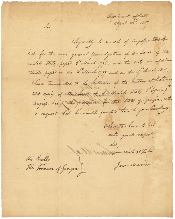 Madison sends the Laws of the United States to Georgia