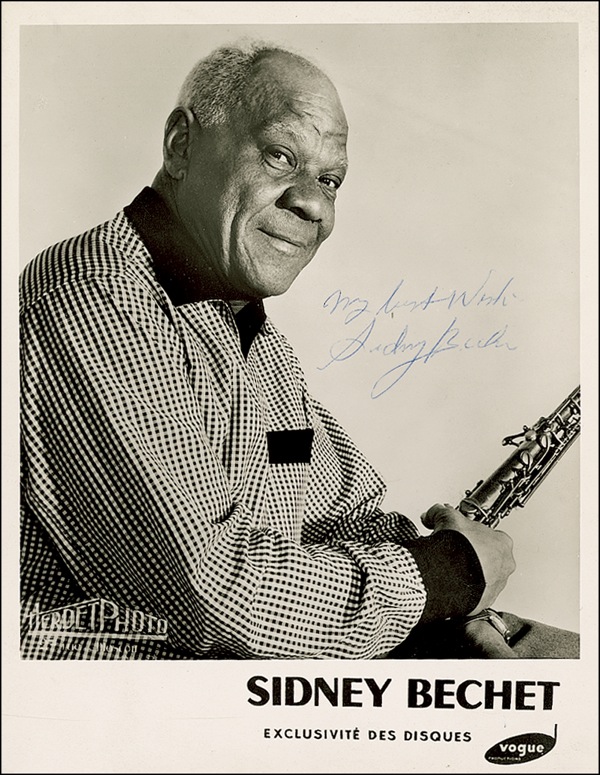 Innovative clarinetist and saxophonist (1897–1959) regarded as one of the greatest wind players in the history of jazz. Vintage glossy 7 x 9 Vogue publicity photo, signed in ballpoint “My best wishes, Sidney Bechet.” A few small surface marks, otherwise fine condition. R&R COA.