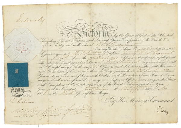 Queen of Great Britain and Ireland from 1837 until her death in 1901. Her more than sixty-three years on the throne remains unmatched in the history of Great Britain and places her among the longest-reigning monarchs of any nation in modern times. The unprecedented growth and prosperity of the British Empire under her rule—as well as a strangely prescient public fascination with the queen and her family—made her one of the most celebrated public figures of her day, and her name would become synonymous with an entire age. DS, signed “Victoria R,” one page, 13.25 x 9.25, May 25, 1846. Queen Victoria appoints Robert Bruce Gent to the position of “First Lieutenant in Our Twenty-third Regiment of Foot.” Signed in the top left corner by Victoria. Document retains its paper seal and treasury stamp. In very good condition, with three vertical folds, scattered toning and foxing, and Victoria’s signature a couple shades light, but completely legible. R&R COA.