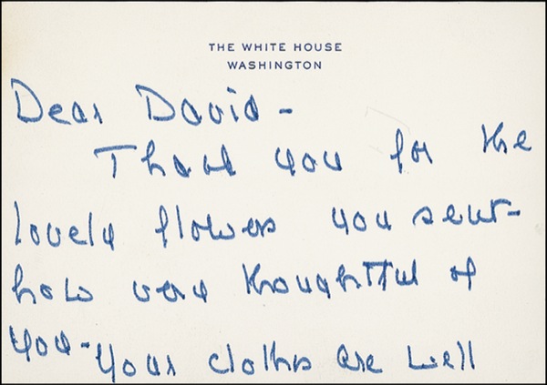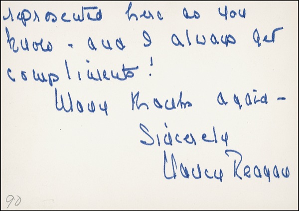 ALS on both sides of a 4.75 x 3.25 White House correspondence card, no date. Reagan writes to David. In full: “Thank you for the lovely flowers you sent—how very thoughtful of you. Your clothes are well represented here as you know—and I always get compliments! Many thanks again….” A hint of mild soiling and edge toning, otherwise fine condition. R&R COA.