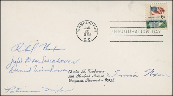 Inaugural Day commemorative cover, 6.25 x 3.5, signed in blue ink by Richard Nixon, Julie Nixon Eisenhower, David Eisenhower, and Tricia Nixon; the cover also bears the autopen signature of Patricia Nixon. In fine condition, with light scattered soiling. Auction LOA John Reznikoff/PSA/DNA and R&R COA.