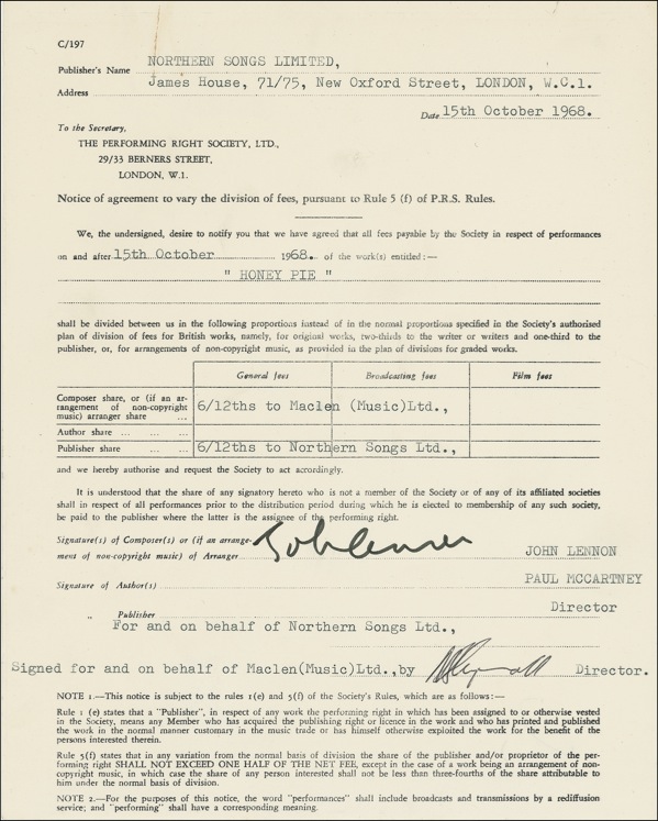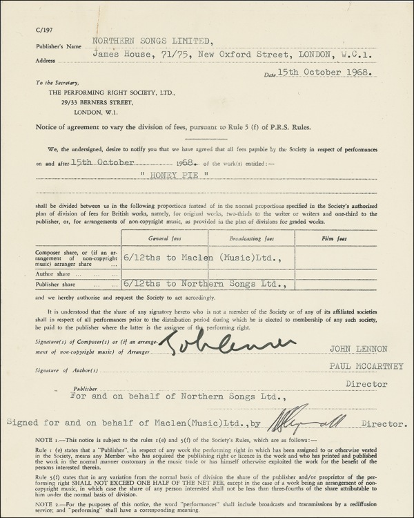 DS, signed in black felt tip “John Lennon” and in black ballpoint “Neil Aspinall,” one page, 8 x 10, October 15, 1968. The document is an agreement between publisher Northern Songs and the Performing Right Society, Ltd. for the division of royalties for the song “Honey Pie,” wherein 6/12ths (the composer’s share) is to be paid to Maclen (Music) Ltd., the other 6/12ths (the publisher’s share) to be paid to Northern Songs, Ltd. Aspinall, one of the key members of the “Liverpool Mafia” who surrounded the Beatles throughout their career, first met Paul and George when they were all students at the Liverpool Institute. Aspinall went on to study accounting, and, while living at the home of Pete Best, bought a second-hand van and became the Beatles' road manager. He later became the band’s personal assistant and, in January 1968, managing director of Apple. Aspinall later headed Apple Films, where he produced the Beatles’ silver-screen swan song, Let It Be. The song named in the document, “Honey Pie,” was first released as a cut on the Beatles’ iconic White Album (1968). A few subtle, unobtrusive creases (lightly touching Lennon’s last name), small paperclip stain to top margin, and neat trimming to (evidently blank) lower margin, otherwise fine, fresh, bright condition. COA Roger Epperson/REAL and R&R COA.
