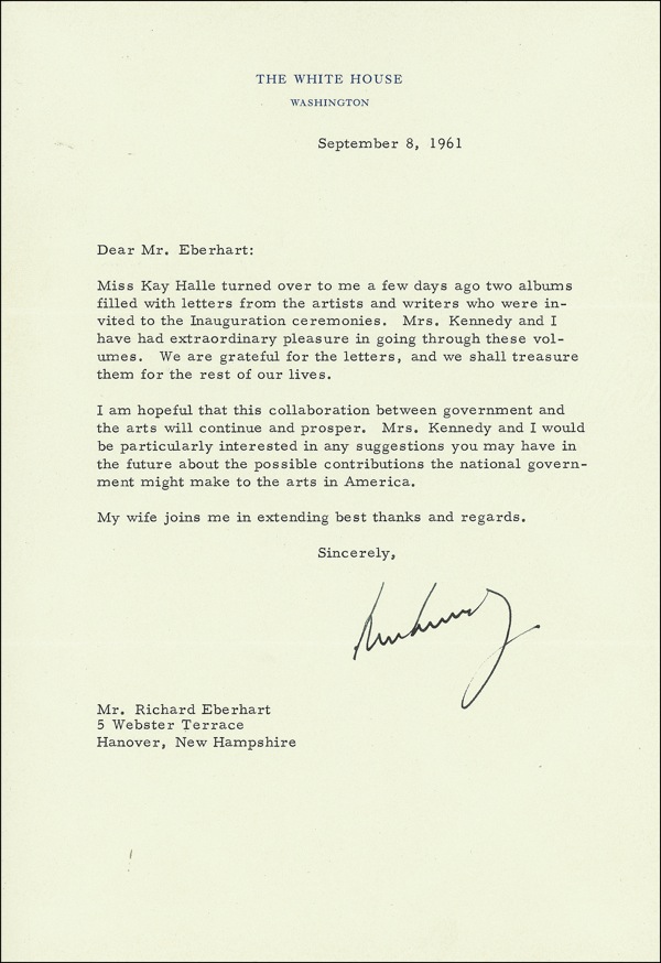 TLS as president signed “John Kennedy,” one page, 7 x 10.25, White House letterhead, September 8, 1961. Kennedy writes to Richard Eberhart in Hanover, New Hampshire. In part: “Miss Kay Halle turned over to me a few days ago two albums filled with letters from the artists and writers who were invited to the Inauguration ceremonies. Mrs. Kennedy and I had extraordinary pleasure in going through these volumes. We are grateful for the letters, and we shall treasure them for the rest of our lives. I am hopeful that this collaboration between government and the arts will continue and prosper. Mrs. Kennedy and I would be particularly interested in any suggestions you may have in the future about the possible contributions the national government might make to the arts in America….” Eberhart (1904–2005) was an acclaimed poet whose collection Selected Poems, 1930–1965 won the 1966 Pulitzer Prize for Poetry. Accompanied by the original mailing envelope. Mailing fold lightly passing through a few letters of the signature, otherwise very fine, clean condition. Auction LOA John Reznikoff/PSA/DNA and R&R COA.