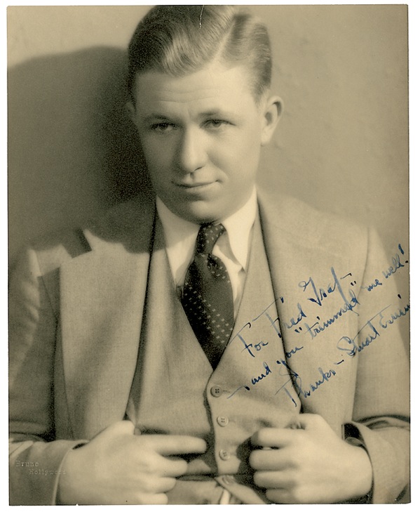 Vintage matte-finish 10.25 x 12.75 Bruno photo of Erwin looking sharp in a three-piece suit, signed and inscribed in fountain pen “For Fred Graf - and you ‘trimmed’ me well! Thanks, Stuart Erwin.” Small tear to top edge and lightly trimmed edges, otherwise fine condition. R&R COA.