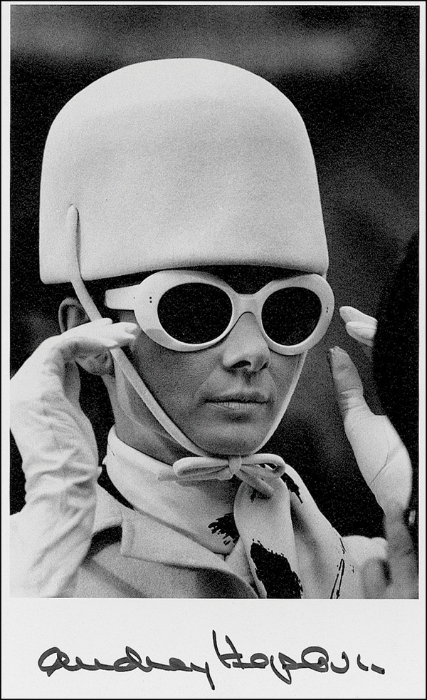 Captivating 4.25 x 7 book photo of Hepburn behind her sun glasses fom Two For the Road, signed in the lower border in black felt tip. In very fine condition. PSA/DNA Auction LOA and R&R COA.