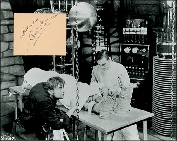 British actor (1900–1937) who earned a place in film history for his performances as Dr. Henry Frankenstein in Frankenstein and Bride of Frankenstein. Severe alcoholism hastened his death from tuberculosis at the age of 37. Vintage fountain pen signature, “Best wishes, Colin Clive,” on a beige 6.25 x 4.25 album page. Signature is matted inside a glossy 10 x 8 photo from Frankenstein. In fine condition. R&R COA.