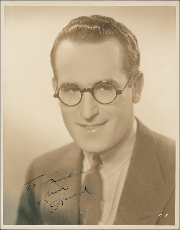 Popular comic actor and director of the silent era (1893–1971), known for his trademark round eyeglasses. Vintage sepia matte-finish 8 x 10 photo, signed and inscribed in fountain pen, “To Franklin from Harold.” Light brushing to ink, otherwise fine condition. R&R COA.