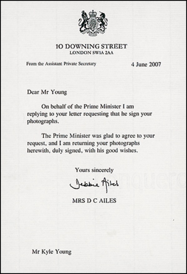 Two identical color glossy 8 x 10 photos of Blair and George W. Bush, each signed in black felt tip by Blair. Accompanied by a 2007 TLS from Blair’s private secretary acknowledging the photos. In very fine condition. R&R COA.