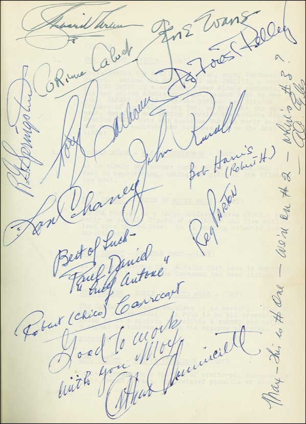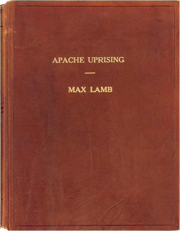 Leather-bound script for the 1966 film Apache Uprising, the personal copy belonging to screenwriter Max Lamb and bearing his gilt-stamped name on the cover, 8.75 x 11.25, 109 pages, signed in ink on a front blank “Lon Chaney” and additionally signed by approximately thirteen other cast and crew members, including director R. G. Springsteen, DeForest Kelley, Rory Calhoun, Richard Arlen, John Russell, Gene Evans, Corinne Calvet, and others. A touch of light wear to covers and chipping to spine ends, otherwise fine, clean condition. PSA/DNA Auction LOA and R&R COA.