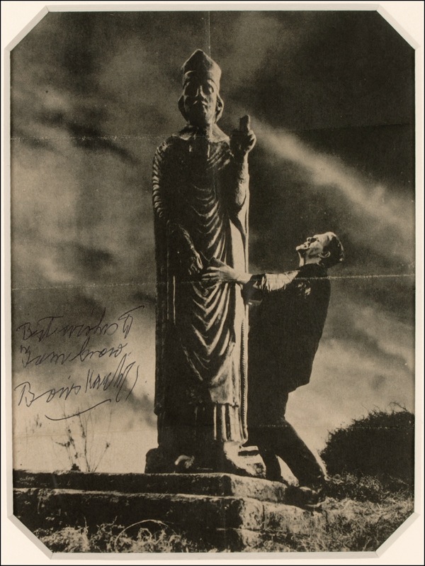Terrific 7.75 x 10.25 magazine photo of Karloff as Frankenstein’s monster, clutching a statue in evident despair, boldly signed and inscribed in ballpoint, “Best wishes to Tom Crow, Boris Karloff.” Accompanied by the original mailing envelope, addressed in Karloff’s hand and postmarked Kensington [Karloff then lived in his homeland of Great Britain], December 13, 1966. Both items are attractively matted and framed together to an overall size of 24 x 19.5. Intersecting mailing folds to photo (which Karloff appears to have purposely avoided with his carefully placed signature), otherwise fine condition. A must for the serious horror collector! PSA/DNA Auction LOA and R&R COA.