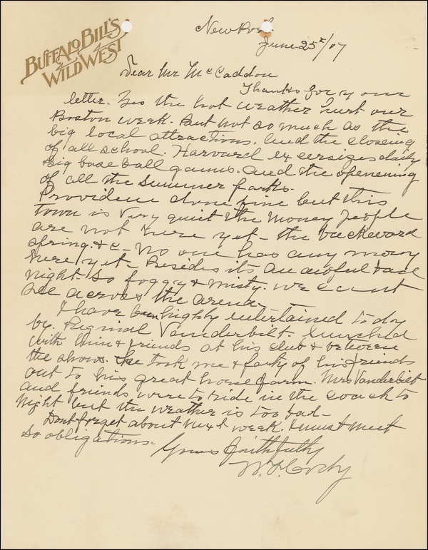 ALS signed “W. F. Cody,” one page, 8.5 x 11, gilt-embossed Buffalo Bill’s Wild West letterhead letterhead, June 25, 1907. Cody writes from Newport to J. T. McCaddon, financial manager of the Wild West Show. In part [his spellings retained]: “Thanks for your letter. Yes, the hot weather hurt our Boston week. But not so much as the big local attractions. And the closeing of all school. Harvard exersizes daily big base ball games. And the openening of all the summer parks. Providence done fine but this town is very quiet the money people are note here yet—the backward spring &c—no one has any money here yet. Besides it’s an awful bad night. So foggy & misty. We can’t see across the arena. I have been highly entertained today by Reginal[d] Vanderbilt. Lunched with him & friends at his club & between the shows. He took me & party of his friends out to his great horse farm. Mrs. Vanderbilt and friends were to ride in the coach to night but the weather is too bad. Don’t forget about next week. I must meet so [sic] obligations….” Accompanied by an unsigned carbon of McCaddon’s reply to Cody, mentioning Cody’s request for a loan and lamenting the poor turnout at the shows in Fall River and Bedford. Intersecting mailing folds (vertical fold to “F”), and small stain and file hole touching one word of header, otherwise fine, clean condition. R&R COA.