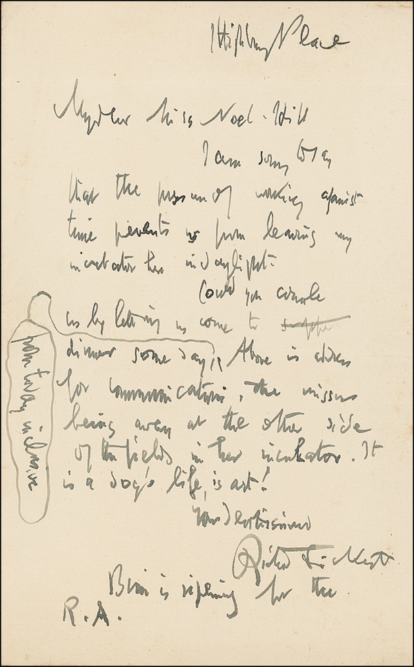 Distinguished British painter (1860–1942), who, with the publication of such investigative works as Patricia Cornwell’s Portrait of a Killer: Jack the Ripper—Case Closed, emerged as a leading suspect in the notorious, still-unsolved murder spree in London in the 1880s. ALS signed “Richard Sickert,” one page, 5 x 8, no date. Sickert writes to Miss Noel Hill. In part: “I am sorry to say that the pressure of working against time prevents my incubation here in daylight. Could you console us by letting us come to dinner some day from today inclusive? Above is address for communication, the missus being away at the other side of the fields in her incubator. It is a dog’s life, is art!….” In fine condition. R&R COA.