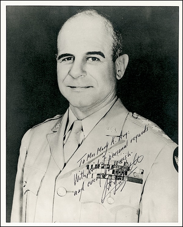 Matte-finish 8 x 10 photo of Doolittle in uniform, signed and inscribed in black ink “To Mrs. Mary K. Aug: With kindest personal regards and every good wish, J. H. Doolittle.” Accompanied by the original mailing envelope postmarked 1966. Slightly indistinct contrast of last name against background, otherwise very fine, immaculate condition. R&R COA.