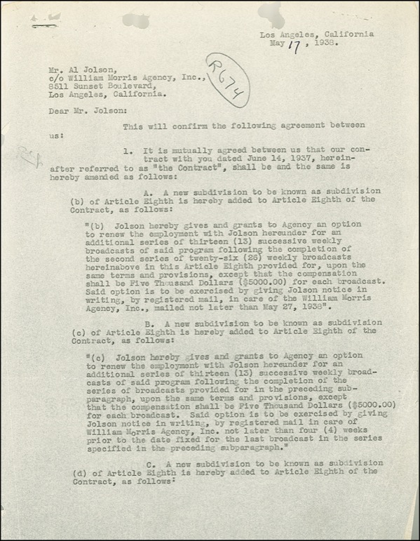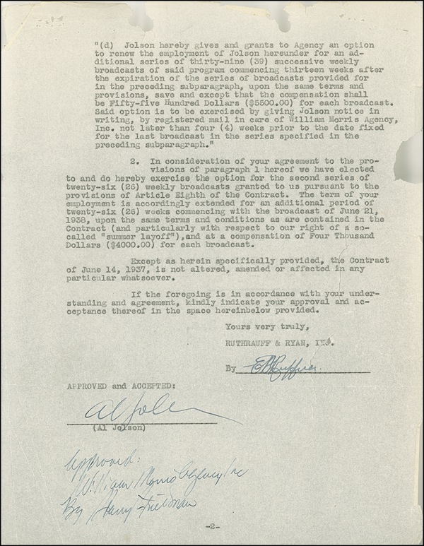 DS, two pages on onionskin, 8.5 x 11, May 17, 1938. An agreement confirming a management contract between Jolson and the William Morris Agency. In good condition, with wrinkles, tears, and chips. No faults affect the clear, dark signature, which itself easily rates as fine. R&R COA.