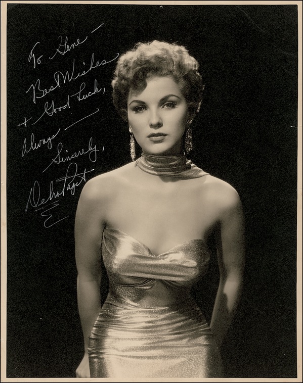 Scintillating vintage oversized matte-finish 11 x 14 photo, signed and inscribed in white ink, “To Gene—Best wishes & good luck always, Sincerely, Debra Paget.” Tiny edge tears and a few light bends to background, otherwise fine condition. R&R COA.