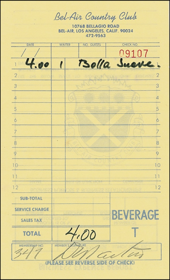Undated 4.25 x 7 beverage receipt from the Bel-Air Country Club, signed in pencil “347 [his membership number] D. Martin.” In fine condition. R&R COA.
