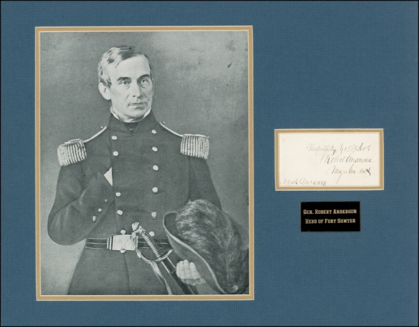 Union general (1805–1871) dubbed the Hero of Fort Sumter for refusing Confederate demands to surrender the fort and enduring two days of bombardment before finally submitting. Ink signature, “Respectfully yr. obt. servt., Robert Anderson, Major Gen. USA, N. York, Decr. 6, 1867,” on an off-white 3.25 x 1.75 card. Matted with a portrait and brass plaque to an overall size of 14 x 11. In fine condition. R&R COA.