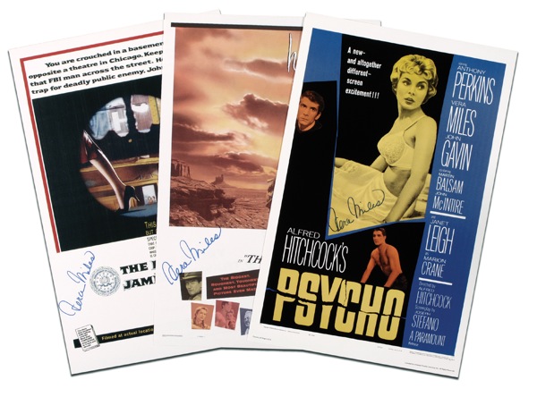 Three different color 11 x 17 mini-posters for The FBI Story, The Searchers and Psycho, each signed in blue felt tip by Miles. In very fine condition. R&R COA.
