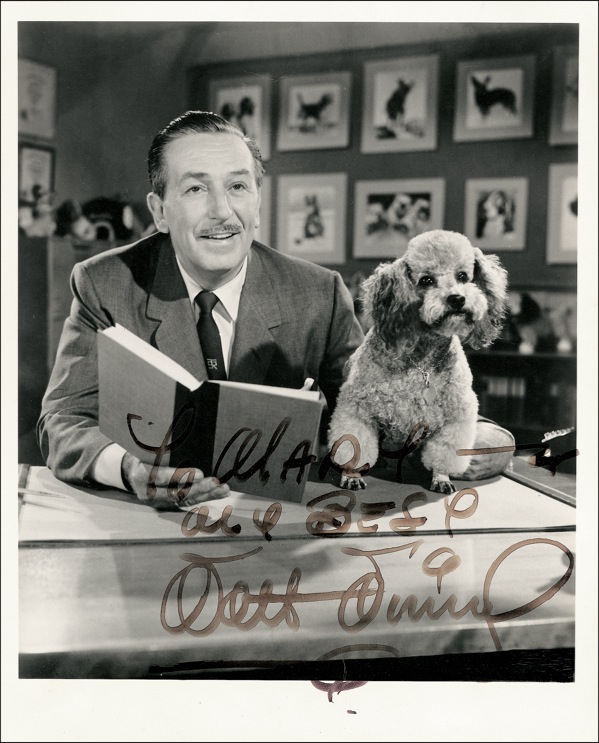 Vintage matte-finish 8 x 10 photo of Disney reading to a poodle, boldly signed and inscribed in early fiber tip, “To Mary, All best, Walt Disney.” A hint of mild rippling, a few small creases, and a subtle shade of fading of ink, otherwise fine, clean condition. PSA/DNA Auction LOA and R&R COA.