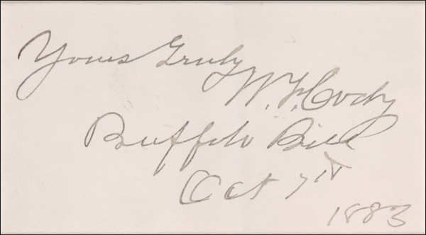 Bold ink signature, “Yours truly, W. F. Cody, Buffalo Bill, Oct. 7th, 1883,” on a white 4 x 2.25 slip. Matted with a color image to an overall size of 13 x 18.75. Light vertical fold, otherwise fine, bright condition. R&R COA.