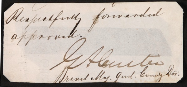 A Civil War general and Indian fighter, Custer (1839–1876) distinguished himself as a cavalry commander, earning the rank of brigadier general of volunteers at age 23. Following the Civil War he became field commander of the 7th Cavalry and led troops in a number of engagements during the Indian Wars. Custer, together with all of the men under his immediate command, was killed at the Battle of Little Bighorn on June 25, 1876. Bold ink signature, “G. A. Custer,” on an off-white 3.25 x 1.25 slip clipped from a document endorsed by Custer. Matted with two color images to an overall size of 18.25 x 13. The slip is tape-affixed to mat board (light show-through of tape touching about half of “G” and top third of “A” and “C”), and corners are clipped, otherwise fine condition. Auction LOA John Reznikoff/PSA/DNA and R&R COA.