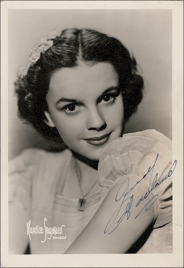 Charming vintage matte-finish 5 x 7 photo of a younger Judy, signed in fountain pen. A very subtle suggestion of rippling, and light brushing to signature, otherwise fine condition. PSA/DNA Auction LOA and R&R COA.