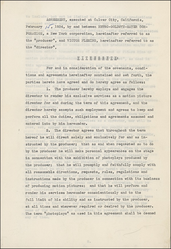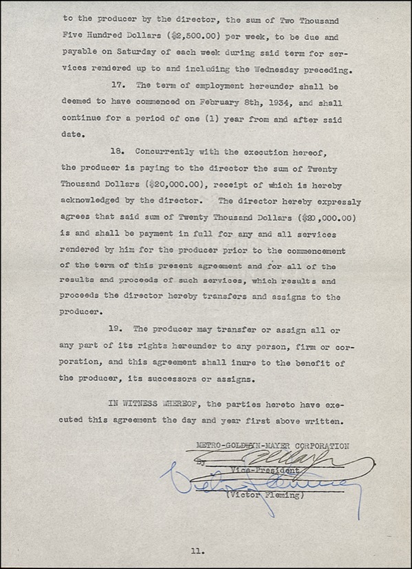 Academy Award–winning American film director (1889–1949) who helmed such definitive classics as Gone with the Wind, The Wizard of Oz, and Treasure Island. DS, eleven pages, 8.5 x 13, February 15, 1934. An agreement wherein MGM engages Fleming’s exclusive services as director for one year at the rate of $2,500 per week, with a “bonus” of $20,000 for services rendered prior to the commencement of the agreement. Fleming has signed in full at the conclusion, along with famed production mogul Louis B. Mayer. The document is housed in its original paper folder. Light handling wear and signatures lightly touching one another, otherwise fine condition. R&R COA.