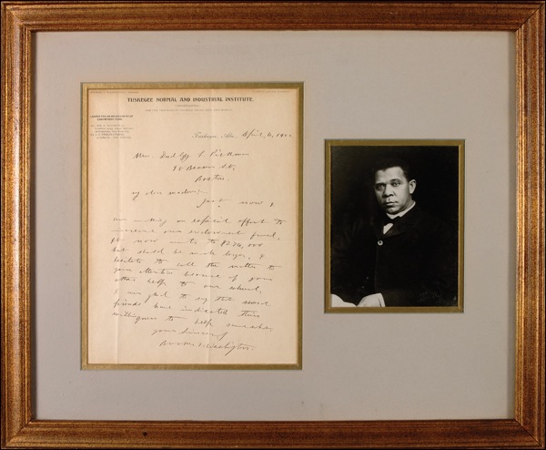 Author of Up from Slavery who founded The Tuskegee Institute to provide young blacks with educational opportunities. ALS, one page, 8.5 x 11, Tuskegee Normal and Industrial Institute letterhead, April 6, 1902. Letter to a benefactor attempting to raise more funds for the Institute. In part, “Just now I am making a special effort to increase our endowment fund. It now amounts to $276,000 but should be much larger…I am glad to say that several friends have indicated their willingness to help somewhat.” Double matted and framed with a portrait of Washington, to an overall size of 20.25 x 16.5. In fine condition, with intersecting folds and a mild shade of toning. R&R COA.