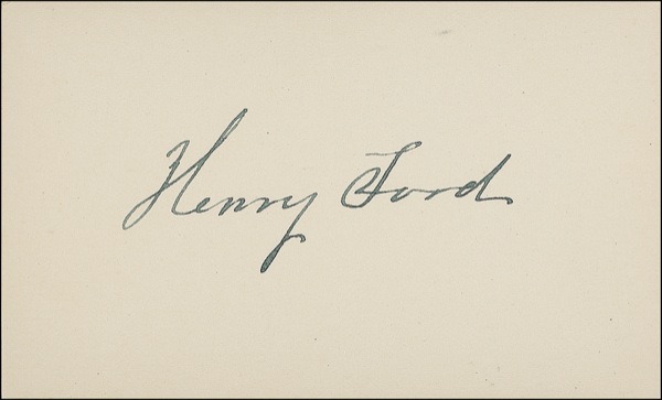 Clear, perfect vintage ink signature, “Henry Ford,” on an off-white 3 x 2 card. Accompanied by an unsigned copy of a 1939 Henry Ford reprint of McGuffey’s New Fourth Reader. In excellent condition. A most handsome example for display! R&R COA.