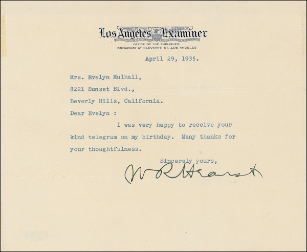 Mining magnate, owner of the San Francisco Daily Examiner, and founder of the Hearst fortune; he expanded sensationalistic journalism. TLS signed “W. R. Hearst,” one page, 8.5 x 7, Los Angeles Examiner letterhead, April 29, 1935. Brief letter of thanks for birthday wishes. In full, “I was very happy to receive your kind telegram on my birthday. Many thanks for your thoughtfulness.” Intersecting folds lightly affecting signature, a few wrinkles, and a PSA/DNA authentication label affixed to reverse, otherwise fine condition. R&R COA.