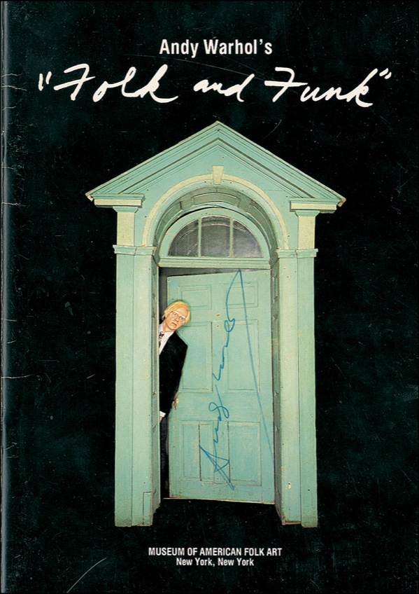Program from Warhol’s 1977 Folk and Funk exhibition at the Museum of American Folk Art, 7 x 10, 26 pages, signed vertically on the front cover in blue ballpoint by Warhol. In fine condition. R&R COA.